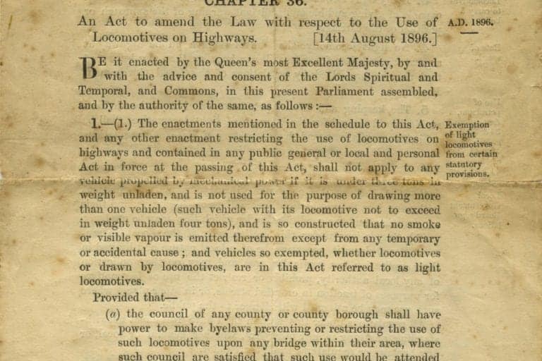 This document is extraordinarily significant to motoring in Britain. It freed British motorists from having to have a man walking in front to warn of their approach (the Red Flag Man), upped the speed limit from 4 mph to 14 mph - but local councils mostly instantly reduced it to 12 mph - and was the reason why Harry Lawson's Motor Car Club organized the Emancipation Day run to Brighton when the Act came into force on November 14, 1896. Which is why we've been celebrating the freedom of the roads with the Brighton Run in November since 1927.