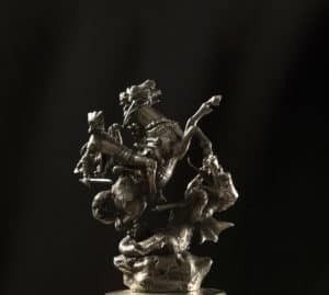 Saint George and the Dragon continues to be a very popular subject, especially for desk art. The legend of Saint George, the patron saint of England and other countries, says he was born in Cappadocia (Turkey), miraculously survived many attempts on his life, and lived in Palestine during the 3rd century where he died by beheading defending his religious beliefs. He may never have been to England. This figure is an example of fine art that has been repurposed as an automotive mascot.