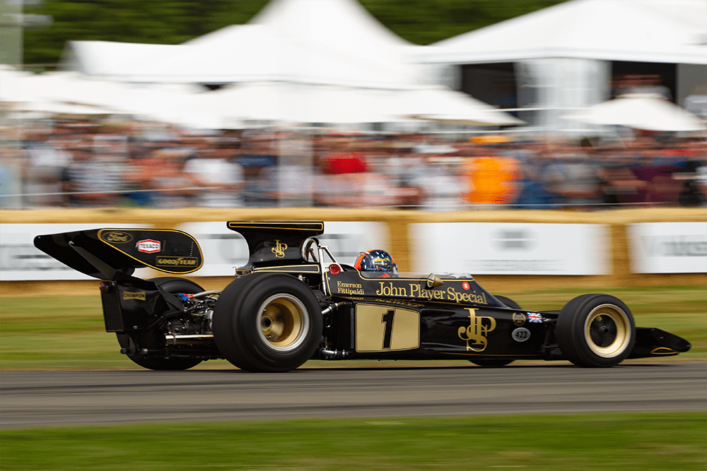 While the timed runs are exciting, it is usually the cars that run untimed that are even more interesting. These often very precious and important machines are rarely seen in action and are often reunited with their original drivers. Among the most poignant reunions this year was of a visibly moved Emerson Fittipaldi with the Lotus 72 that he drove to the Formula 1 World Championship in 1972. After having scored many successes in what he considered his favorite Lotus, Fittipaldi crashed the car. Instead of wasting time rebuilding the wreck, Team Lotus simply decided to use a spare chassis. The wreck was stored for many years and was only recently restored by Classic Team Lotus for Fittipaldi to debut at Goodwood. He reported that it felt exactly the same as it did well over 40 years ago. Another goose-bumps moment was the celebration of the 50th anniversary of Jackie Stewart’s first of three World Championships. The Scotsman was back in his 1969 Matra, while his sons Mark and Paul were close behind in the Tyrrells he had used for his successful title attempts in 1971 and 1973.