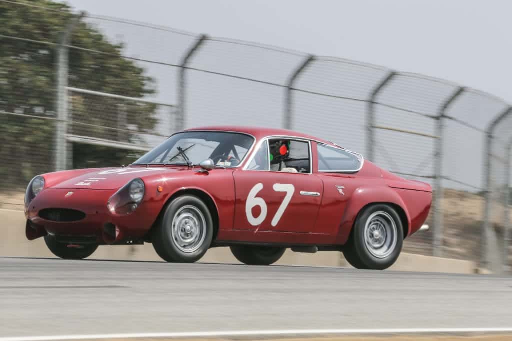 Accelerating out of the Corkscrew, Gunnar Jeannette rushes the 1455-pound Abarth, which was based on the Simca 1000 economy car, down to Turn 9. Photo: John Lamm